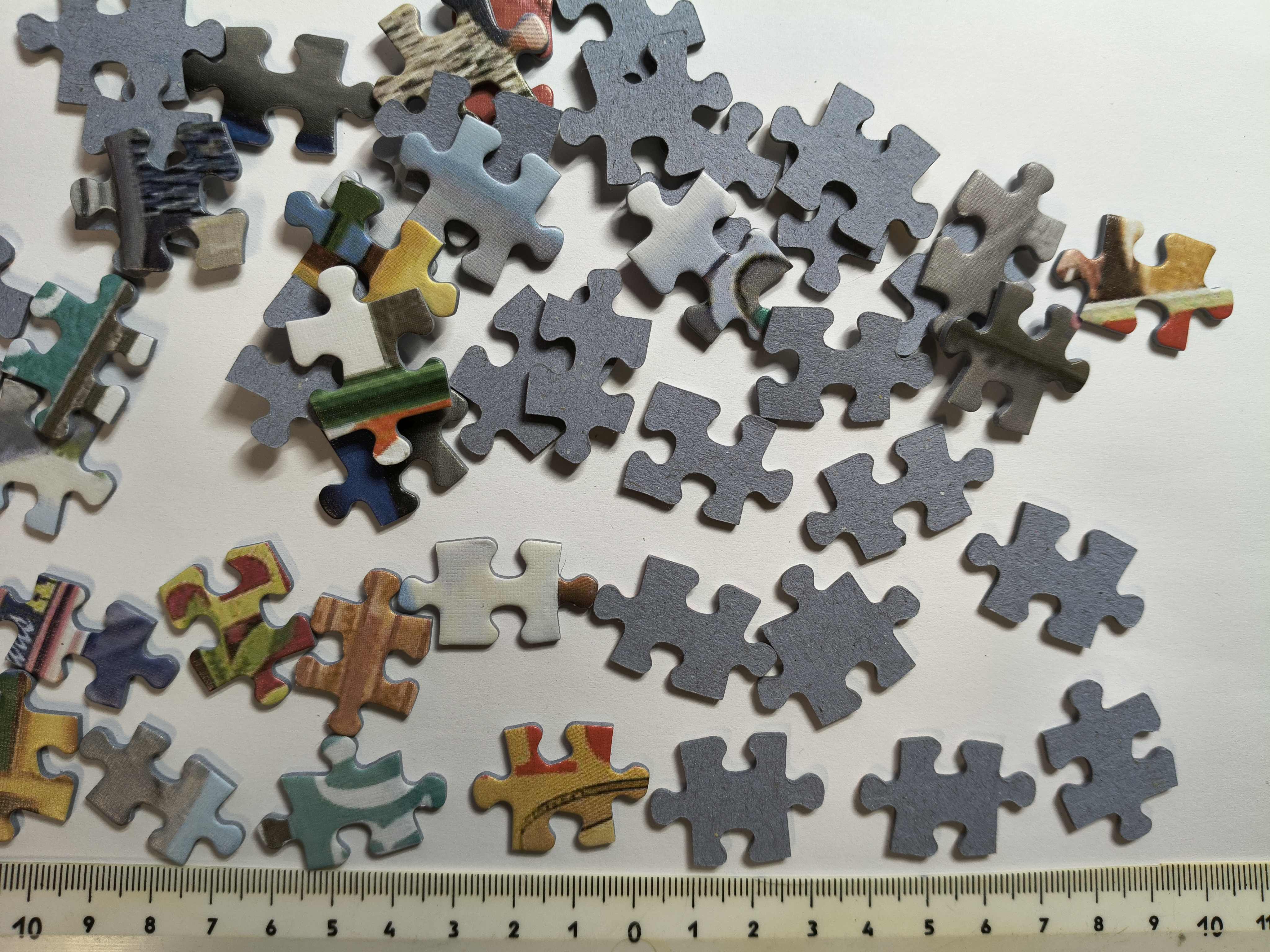 Mój ulubiony typ puzzli - tradycyjny wykrojnik, bardzo dobrze spasowane, ale bez przesady - dają się rozdzielić bez zniszczeń :) mocno sprasowane - żaden nosek nie odstaje, nie grozi odpadnięciem. kolory ładne. Na obrazku sporo się dzieje no i są napisy :) Relaks bez cienia frustracji gwarantowany!